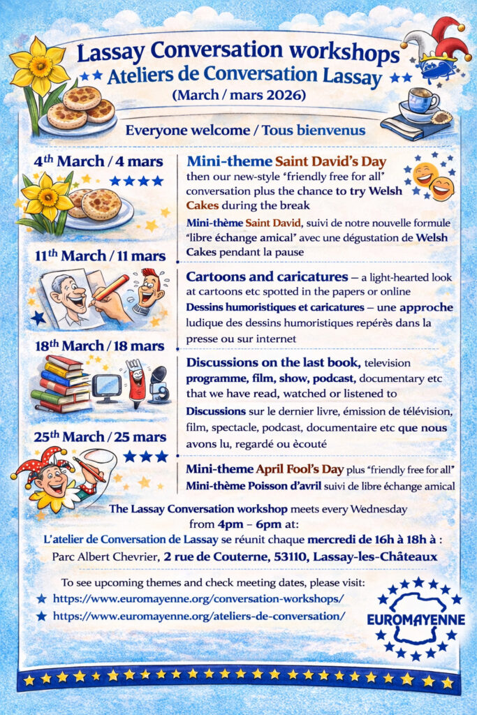 Gratuit pour les adhérents EuroMayenne, sauf une contribution libre (jusqu’à 1 euro) pour couvrir le coût des boissons et des biscuits.