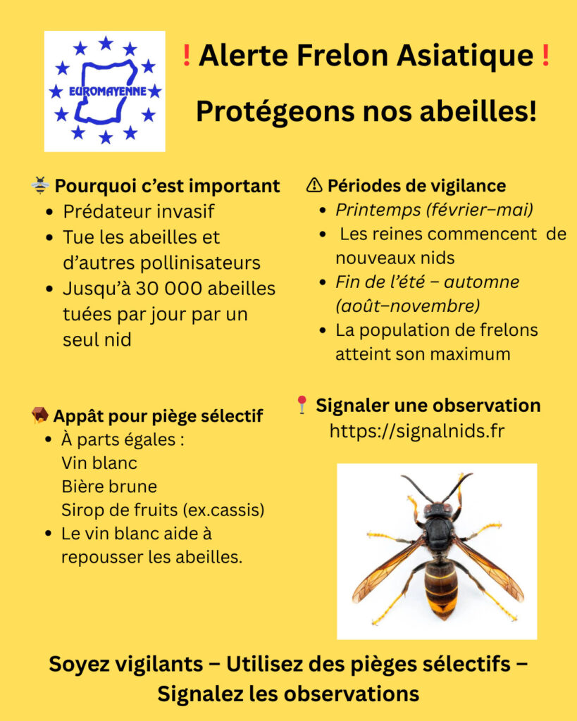 Comme cela a été évoqué lors de la réunion du groupe Nature et Jardinage de l’Association EuroMayenne en février, un seul nid de frelons asiatiques peut produire plusieurs centaines de reines en une seule saison, et un grand nid peut tuer entre 3 000 et 30 000 abeilles par jour.