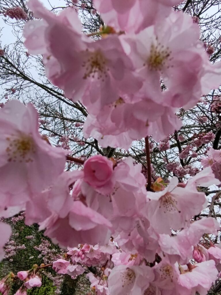 À notre arrivée à La Visitation, la vue des nombreux cerisiers en fleurs roses sur le parking nous a immédiatement réjouis, compensant ainsi la météo pluvieuse.