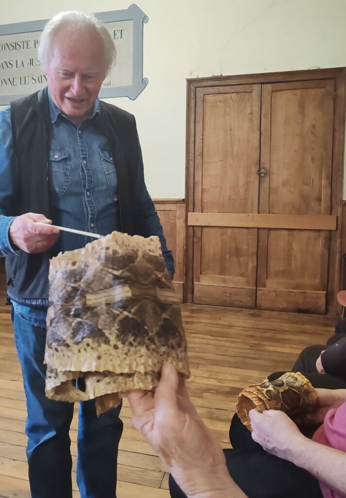 Notre réunion a débuté par une présentation captivante de Pierre Lafrance sur ses expériences avec les grands serpents et sur les petits serpents présents dans notre région. Pierre a commencé par partager un souvenir d’enfance lié à sa passion pour les serpents, illustré par une photo de lui à 14 ans tenant un serpent au zoo de Londres. Les membres ont pu manipuler et examiner différentes peaux de serpents tout en écoutant les nombreuses anecdotes de Pierre. Il a également expliqué certaines des caractéristiques clés permettant d’identifier les serpents venimeux et non venimeux et a souligné les particularités qui aident à distinguer les différentes espèces.