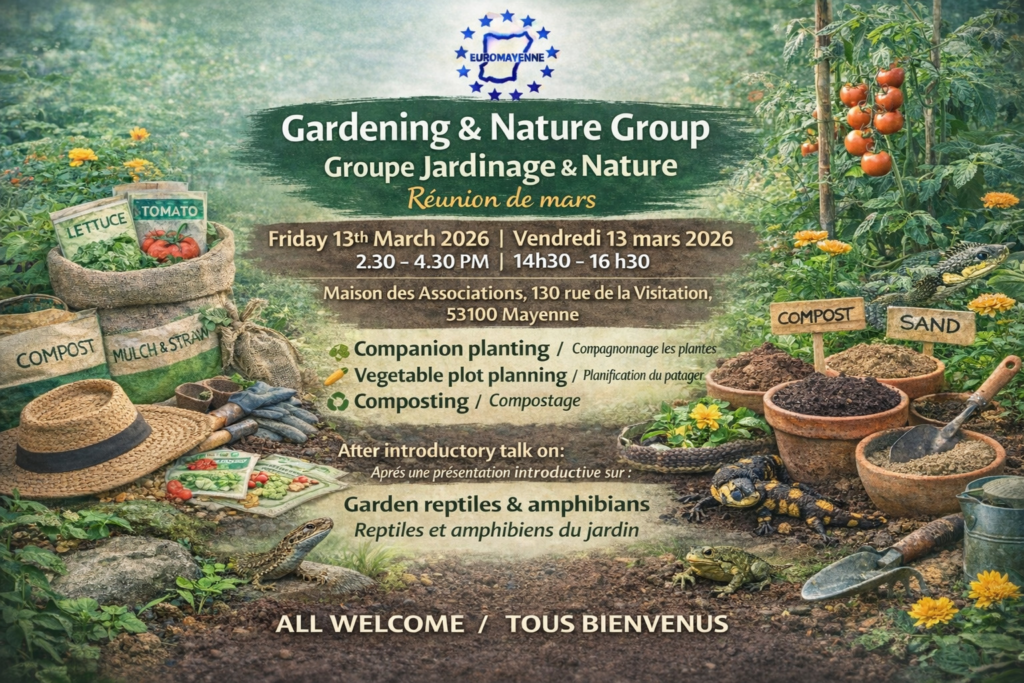 | 13 March | La Visitation, Mayenne. (2.30 to 4.30 p.m.) | Talk on garden reptiles and amphibians. Companion planting, vegetable plot planning and composting. |