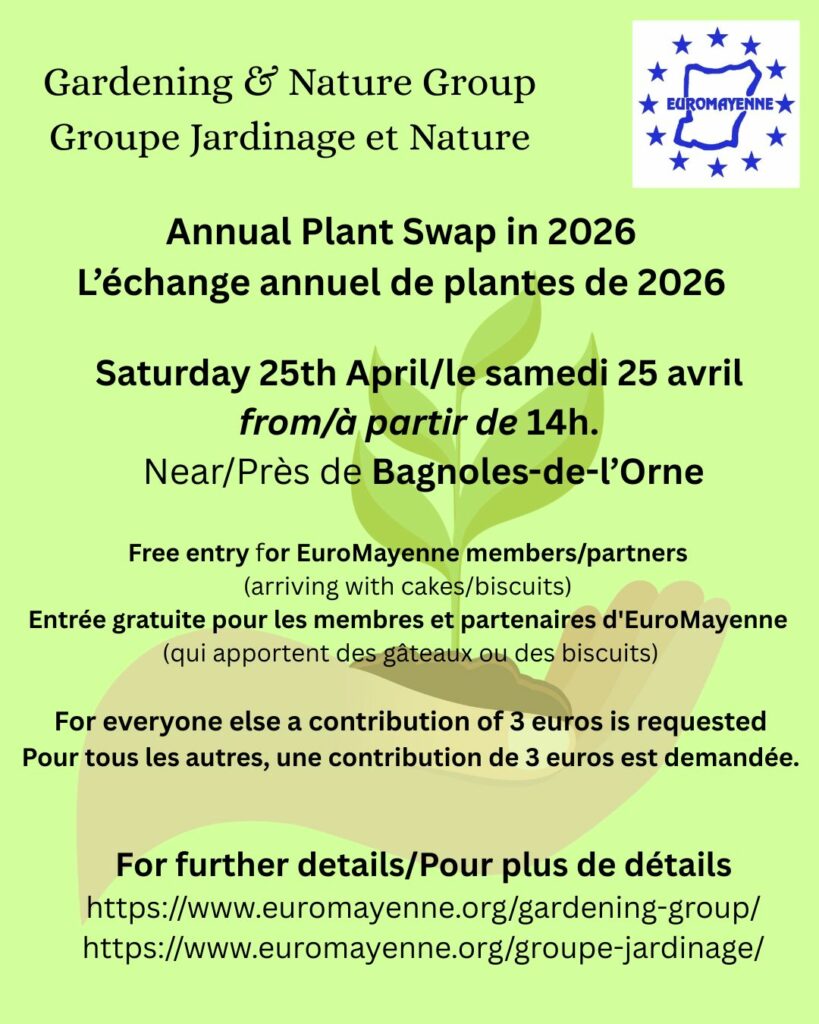 | 25 April | Stephen and Julia’s garden, Normandie. (From 2.00 p.m.) | Plant Swap and afternoon tea. (Please see above for more details.) |