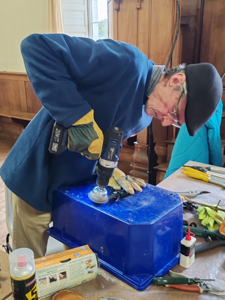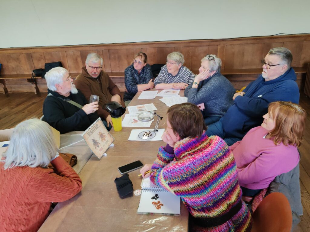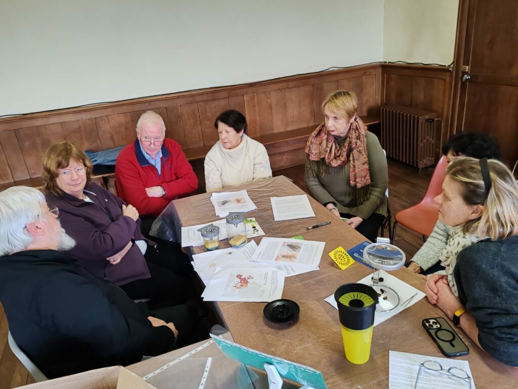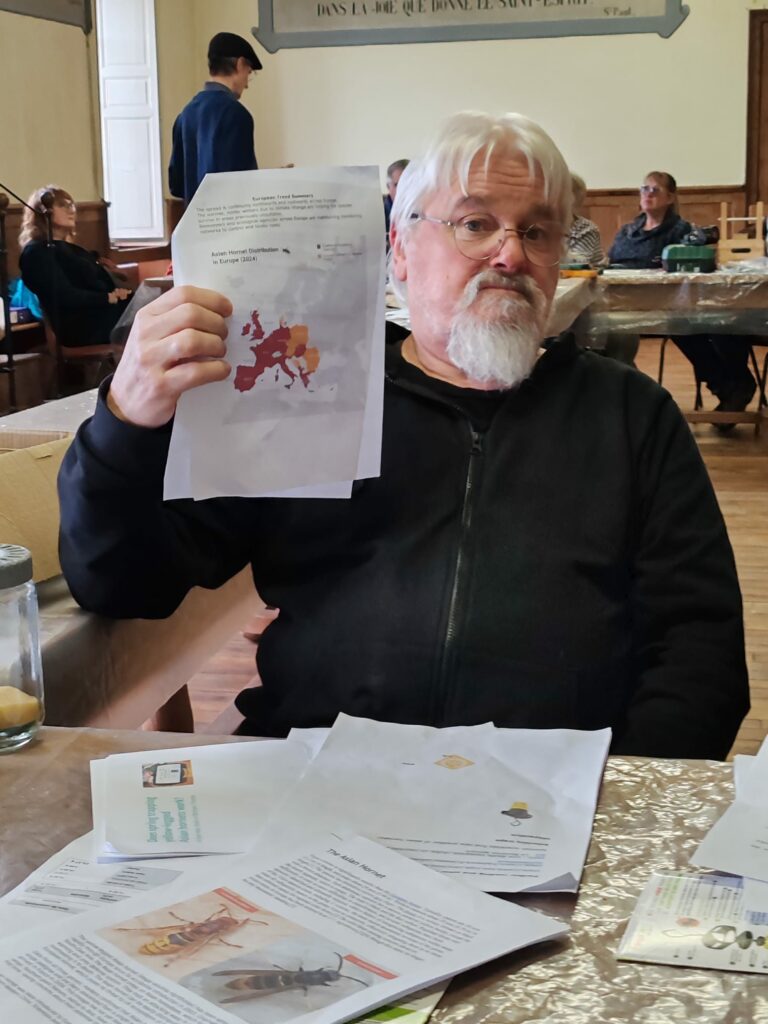 Tony ‘stirred the nest’ with an eye-opening presentation on Asian hornets — their arrival in France, spread across Europe over the past 22 years, and the serious threat they pose to honey bees. Participants examined three types of selective traps and discussed the importance of protecting other insect species. There was also the opportunity to compare Asian and European hornets up close.